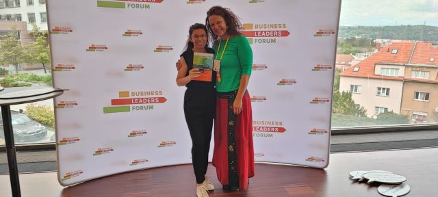 Fotografie zachycuje slavnostní předání knihy jedné z recenzentek Mgr. Michaele Stachové, MBA, Executive Director, Business Leaders Forum, které proběhlo v rámci konference Future-Proof Leadership 2025 17.9.2025.
